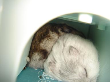 「おかーしゃん、今日はニコニコしてましゅね!ぱしょこんの前で、泣いてばかりいたでしゅからね・・やっぱり、笑ってる方が美人しゃんでしゅよ。」「えっ!ほんと?」「うそだぴょ~~ん!」「今日はそこで立っていなさい!・・」「ご・・ごめん、くしゃい!」←突っ込まないで、スルーしちゃってください!「毎度でしゅが・・食べながらでしちゅれいしまちゅ・・みなしゃま、僕のお友達の事で、協力してくだしゃり感謝していまちゅ!こんな小さな僕たちなのに、あっ!マーチはメタボで、でかいでちゅがね!大勢の人たちが本当に協力してくれたでしゅね・・嬉しかったよね。」「うん、そうだね・・本当に嬉しかったね!皆様ありがとうございました!ハムちゃんは幸せを目指して歩き始めつつあります。ご協力本当に有難うございました!」「よかったでしゅ!一安心、でしゅ!」「ようやく安心して、寝れるでしゅ・・実は、ずっと寝不足が続いていたんでちゅよ・・・昨夜も一晩中起きてたでしゅよ・・・しょのせいか、お昼はぐっしゅり寝れたでちゅがね!」byマーチ 「へッ!!!いつもだし、夜行性だし~」「ぐっ!ぐるじ~~ぃ・・・重いでしゅよ・・・いい加減にしてくだしゃぃ・・何でちっちゃな僕が、いちゅも下なんでちゅか・・?」byハム君一応息苦しいのか、二人ともしっかり、お鼻を出してます・・我が家の七不思議の一つ・・どうやって入ったのかしら?「うるしゃい、お兄ちゃんでしゅね・・全く!しかたないでしゅねぇ、毛繕いしてあげましゅからじっとしてるでちゅよ!」「こっちは、せいせいだよっ!さ・・寂しくなんかないやいっ!」・・・・・・・小・・小金・・恥ずかしいから・・食べ物持って寝ないで・・躾が・・みやっちさんに何て言われるか・・・「気にしな~い!気にしな~い今頃ビール飲んで、酔っ払って寝てる頃でちゅよ!」by小金