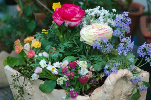 普段はあまり 黄色とピンクと紫と・・・という組み合わせで寄せ植えすることはないのですが衝動でバラバラに買って 寒さから守りすぎて軟弱になってしまった苗をまとめ植えしよう!と ラナンを追加して植えました。ファンシーカラー寄せ!手前に垂らしたクレマチスの開花が楽しみです。プリムラ,かわいかったんだけどなぁ・・・部屋で育ててしまったので ひょろひょろになってしまいました。つぼみも もうありません。 残念。