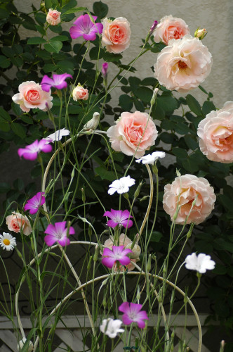 今年も 懲りもせず 国際バラとガーデニングショウのハンギング出品してしまいました(~_~;) 毎年 搬入に行くと 他の素晴らしい作品に 圧倒されて けっこう 恥ずかしい思いをしてるはずなんですけどね 1年経つと すっかり忘れて また頑張ろう!と思う前向きな私です いつもながら 作品に自信が無いので部分公開(^^ゞ 見るに耐えられる角度からの撮影ですな(^^ゞ いつの日か 全体を自信をもって 公開できるような 作品を作りたい! それにしても 皆さん いったいいつ頃 植え込んでいるのでしょう? 早く植えれば 開花時期の見込みがたてづらい ギリギリだと 苗がなじまないし・・・ 不思議なくらい 皆さん 完成度が高いです ちなみに私の作品は 撤収時にはほぼ お花は終了でしたカラーリーフ のみ ハンギング(^^ゞ 会場の素晴らしい模様は またいつか・・・ 忘れないうちに(*^。^*) 続いては お気に入りの ディスタントドラムス 一目惚れして購入しちゃったバラ我が家で2回目の春です この アプリコットからワインカラーへのグラデーションどうです! 素敵でしょ!! バレリーナと一緒に・・・ もう ベタ惚れです