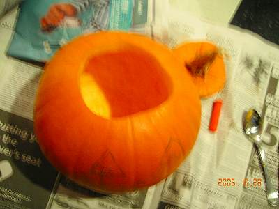 やったわ・・ついに・・・人生初の Jack o'lantern お化けカボチャ作り!これよ!これを待っていたのよ!!引越したかったけど、しなかった理由の一つ!!(小さいな~^^;)本場のHalloweenを楽しむ!!!それには、このお化けカボチャがないと始まんないわよぉーーーー!ということで、お化けカボチャの作り方始まり~~はじまりぃ~。まずは、かぼちゃの へた の部分をふたになるように綺麗にきりとります。そして中身を出します。たくさん入っているのかと思いきや、結構スカスカです。種がモジャモジャの根のようなものでたくさん繋がっていますがそれを根こそぎスプーンやナイフを使ってかきだします。頭の悪い人を、「このカボチャ頭!!」などと悪口を言ったりしますが、日本の緑色のカボチャではあまり実感がわきませんでしたが、なるほど、これが、カボチャ頭ねーー。確かにスカスカだわ~。と妙に納得。こんな感じね。そんでもってそして下絵を描いて、彫るべし彫るべし!!!!小さなのこぎりのような刃で簡単に切れます。以外に病みつきになりそうなくらい楽しい作業♪できあがり、満足満足♪すっごビックスマイル!!って感じじゃない?いいわ~。(自画自賛)他の家族が彫ったものはこちら↓
