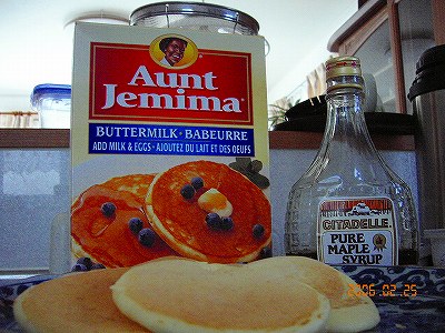 今朝は、ちょっと気分が良かったので朝からパンケーキを焼いてみました。バターとメイプルシロップでいただきました。このまま、つわりも去っていってくれればいいのですがねぇヽ(´~`;ウーン さて、使ったのはカナダから買って来た Aunt Jemima のパンケーキミックス。カナダではポピュラーなパンケーキミックスです。ホストファーダーはこれに生プルーベリーを入れていつも焼いてくれました。私にとってカナダの忘れられない味のひとつです。甘みのなかに程よいすっぱさがあって、とってもおいしかったな。先日植えたブルーベリーが今年の夏に実をつけてくれればブルーベリーパンケーキに挑戦でいるのにな。