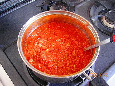 友人がみんなで近々遊びにくるというので、その時の練習にとカナダのホストファミリーがよく作ってくれたスパゲッティソースを作ってみた。大量のホールトマトを使っていたから、トマトソース、って考えてたけど思い出してみると、ひき肉も大量に入っていたんだよね。ってことは、ミートソースか???作り方までは聞いてこなかったので、とりあえず適当に作ってみることにした。オリーブオイルでニンニクをいためたあとに、たまねぎのみじん切りを炒めて、豚挽き肉を入れてみた。トマトのホール缶を二缶入れてひたすら煮ること30分。塩コショウで味を調えた。見た目はソックシ!!!だけどあの後引くおいしさのうまみは違うなぁ・・。何がいけないんだろう。素直にメールして聞いてみようかな・・。