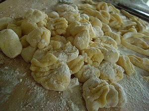 昨日は前から作ってみたかった「じゃがいものニョッキ」をトライ!!これが思ったより難しい!&キッチンよごれるぅ~~あ~~んど、おにぎりをおんぶしていたんですが、結構時間がかかり紐がくいこむぅ~~~。思いのほか疲れました。(´Д`) =3つぶしたジャガイモ(小3個)に小麦粉(100グラム)と卵(判子)をまぜまぜ。でもジャガイモの水分が思いのほか多かったのかまとまらなかったので小麦粉を足していきました。足したつもりでも、形を形成してしばらくしてみてみるとクタ~~ッと。中にはくっついているものも!!打ち粉がたりなかったのか・・フム。初心者には難しい!!前によく食べに行っていたレストランのジャガイモのニョッキは細長い形だったので真似してつくってみました。どっちも食してみましたが細長い方がソース(バター・生クリーム・塩・胡椒)によく絡んで美味しいかも。味は正直、まぁまぁ・・・でした。ちょっとコクが足りないかんじ。初めてだったのでレシピどおり作ったけどベーコンとかのダシがあったらもっとおいしかったかも。やっぱりプロの味は難しいなぁ。