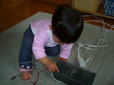 だんなさんの部屋に入り、なにやら静かに一人遊びのおにぎり。そ~~と覗いてみると、一生懸命、なにやらプラグをつなごうとしていました。注目なのは、この足先!!集中すると 足指に力がはいるだんなさんの癖がここに!!変なとこまでだんなさんにそっくり~~~門前の小僧がなんとやら、先日のだんなさんの行動が再現されているようで笑えました。子どもってちゃんと見てるんですよね。くしをみれば、髪にあてたり、靴下をみれば足にあててみたり。当たり前が面白い、今日この頃です。
