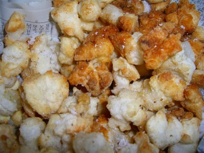 この寒い時期に、母がよく作ってくれた味を再現してみました。考えてみると、お正月の余ったお餅活用法だったようですね( ̄▽ ̄;Aこんな風にして食べるのは、こっちだけでしょうか~~。かたーーーくなってしまったお餅を、トンカチで割って・・・と母はしていましたが、それが大変なので、ある程度乾燥したところで手で割ってみました。そこからもうチョイ乾燥~~~なんて余裕をしていたら・・・餅がカビちゃいました _| ̄|○il|li ガクッ乾燥してから、トンカチで割る・・・これが正解のようです。小さくした後にカビると、その分、カビる面積が広く・・・。あげたらお砂糖をかけて食べます♪旦那さんのところは塩あじなんだとか。砂糖をかけた後に言われてもねぇ(; ̄Д ̄)カリカリしておいしかったです。ついでにお正月に余った黒豆もミルクプリンにしてみました。牛乳と黒豆をミキサーしたのですが、牛乳が思いのほか泡だってしまいました。そのまま固まって二層になっています。私は、食感が面白くておいしい~( ̄▽ ̄)と感じたんですが旦那さんには不評でした。でも味はおいしかったですよ~。