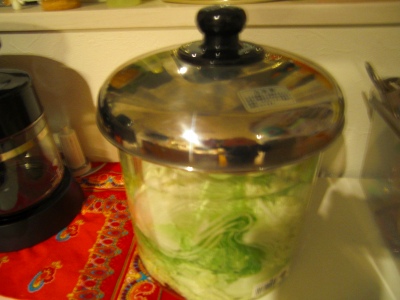 義母から。「白菜」がどっちゃり。私の中で一つの衝動?が湧き上がり、どうしてもソレをとめることができない。私の中は、ソレをすることで頭がいっぱい。それは・・・・それは・・・・キムチ (キンチ←韓国人に教わった発音。)「ム」じゃなくて口を閉じたまま「ン」なんだって・・ってどうでもいいけどね。キムチをつけたーーーーい!! └( ̄^ ̄)┘あぁ・・漬けたくってしょうがない!!いえ、今までだって、キムチが好物ってわけじゃなかったのだけれどでも今年は、なぜか、キムチが食べたくてしょうがない。市販のキムチを買って何度か食べているうちに、自分でもつけたくなってしまったのでした。だって、ほら、買うと高いでしょ?でも問題は味!おいしいのが食べたいのよね。できるかな・・( ̄▽ ̄;A という不安はあるものの、とりあえず、韓国産の唐辛子と、アミの塩辛、イワシのオイルを注文。思い余って、昨日すでに、白菜を塩漬けにしてみた。だって、今日来ると思って。(勝手に早とちり)明日だった・・・来るの _| ̄|○il|li ガクッキムチ作り若葉マーク。ちゃんとできるかな??でも漬けるのが楽しみです♪できたら報告しマース。