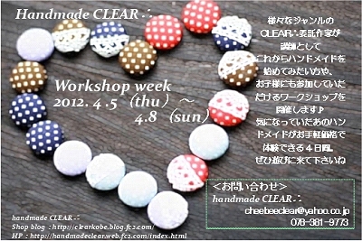 昨日、「handmade CLEAR∴ Workshop week」初めてのことだったので、「誰も参加してくれなかったらどう~~~しよう~~~」と思っていましたが、たくさんの方に作っていただくことが出来ましたご参加してくださった皆様、本当にありがとうございました作ってもらった方の全員のお写真を撮らせていただくことが出来ず残念でしたが、(撮影する余裕がなかったの・・・)皆様、どの組み合わせもとっても可愛くて~~~私が勉強させてもらいました今回は・・・店頭販売も一緒にさせてもらったんですが、こちらもたくさんのお客様に作品を手に取っていただくことが出来ましたありがとうございますっhappyちゃん&azazちゃん、本当にありがとう~~~店長さん、komeさん、お世話になりました~~~ありがとうございましたまた頑張りたいですっ春休み中はちょっぴりおうちのことが忙しく(遊ぶのも忙しかったけど・・・)何も作ることが出来なかったけど、来週からはバリバリ作っていきたいと思いますあっ。。。昨日は子供達を連れて行ったので・・・そのことも書きたかったけど・・・長くなったのでまたそのことは次回にでも本当にありがとう~~~ございましたっhandmade CLEAR∴さん、今回からネットショップにも色々並べてもらいます是非~覗いてみて下さいネットショップネットショップに掲載する商品は、店内販売(店内での陳列)はありません。ネットショップ限定販売となります。遠方のお客様で店舗用商品が気になった方は直接お店の方にお問い合わせ下さいhandmade CLEAR∴: Tel : 078-381-9773: mail :cheebeeclear@yahoo.co.jp↓↓↓ランキングに参加しています↓↓↓ポチっとしていただけますと嬉しいですものすごく励みになりますっよろしくお願い致しますにほんブログ村子育てスタイルに参加中♪ありがとうございましたポチをしていただいても画面が完全に開かないとカウントされないようですお手数ですが・・・画面が開くまで待ってやってください