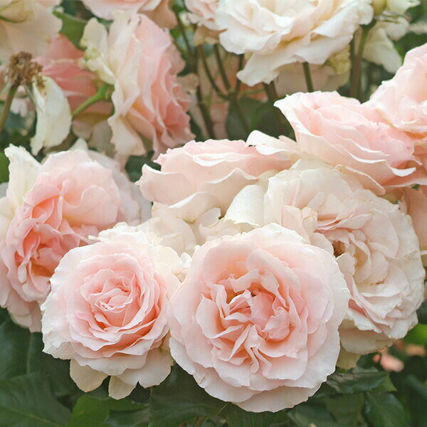 今日は朝から良く晴れたいい天気です。庭のバラの花も終盤に差し掛かっています。今日のバラはERのローズマリーです。ヘリテージの枝変わりで、アーチ状の樹形。ディープカップのコロンとした花が房咲きになります。香りはフルーツ香で中香。中位の花が房咲きになった姿は可愛いですよ。但し難が1つ。。。花持ちがとても悪いのです。( ̄~ ̄;)あっという間にハラハラと散ってしまいます。もう少し持ちが良いといいんだけどな~。という訳でローズマリー既に花が終わってしまいましたので、これは1週間前位の写真でございます。 ☆ ローズマリー苗 ☆