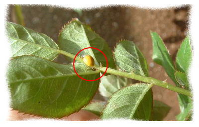 今日バラの水遣りをしているとき、葉に1匹の 黄色いてんとう虫 を発見!