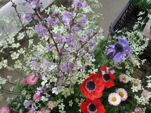 昨日まで、スッキリしないお天気でしたが、今日は絶好のお洗濯日和。 雨の翌日は、花粉もとっても飛ぶようで、予防のためにマスクに手がいきます。 花粉症ではないですが、心なしか喉がイガイガしたり、目のかゆみがあって、 つい、めをこすってしまいます。 何年か前には、花粉はどこ吹く風という感じだったのに・・・。 体内に蓄積していっているのでしょうか?! でも、今日は天気につられて、大好きなアネモネを使った寄せ植えを 作って見ました。 昨年はチューリップとルピナスを同じ鉢に植えたのですが、今年は花木を どうしても使って作りたいと思い、園芸店でチョウジザクラを調達してきました。 ジンチョウゲ科の耐寒性落葉低木で、1メートルから1.2メートルほどに なるようです。もちろん、庭植えも可能です。花の時期は3月~4月頃 淡い藤色の花がみられるようです。 どんなお花が咲くのか楽しみですが。花を見ぬうちにお嫁に出してしまうかも しれません。 手元に置いて、眺めていたい気もします。 サクラソウはこんもりとライムグリーンの花が咲く、ウィンティー。 カスミソウのようなイメージがつくれますね。 アネモネは思い切って赤と紫を選んでみました。 少し派手かなと思ったのですが、春だから楽しげにしてみました。 明日はまた、雪の予報が出ていて寒そうですが、 野菜教室のお仲間達と河津桜と、つるし雛を観にいく予定です。こちらから、庭工房のホームページもご覧になれます。