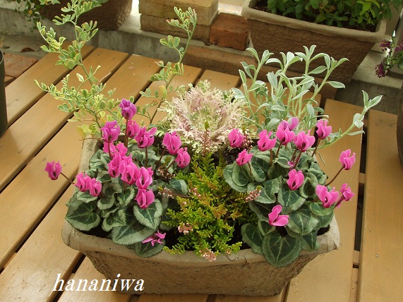 今日は昨日より、気温が下がり段々と本格的な冬に近づいてきました 最高気温16度 最低気温9度 先日、30%引きでにぎわっていたサカタノタネで買った苗が、届きました 冷静さを欠いて、今日までだからと、あたふたと買ったせいか 同じような色のものを買ってしまったなと、ふたを開けてみて思って しまいました 気を取り直して、苗が悪くならないうちに、ひとつ植えこみました クリスマスを迎える寄せ植え お客様から預かっている大きめの鉢に、クリスマス用の寄せ植え を作って見ました コニファー入れたのでオーソドックス型に なってしまいましたが・・・・ 喜んでくれるかな? 昨年使ったシルバーグレーの形が崩れたコニファー キンギョソウ ソネット (ピンク) コプロスマキルキー (チョコレート色1p バリエガータ1p) カルーナ シロタエギク ネメシアアロマティカ (濃い紫) ガーデンシクラメン (オールドファッション) 四季成りイチゴ 小鳥さんのピックを入れて、森のクリスマス風に・・・ 形の崩れてしまったコニファーも、何とか活かせないかと リースハンギングに使ったリボンや松ぼっくりで飾ってみました 上からです 先日、サカタノタネさんで目が合って、どうしても連れ帰りたかったのは オールドファッションと名付けられた、ガーデンシクラメンです 原種シクラメン コウムの寒さに強い性質と 可愛い姿を併せ持つガーデンシクラメンのようです ホワイトピーチオベーションの2番目のお花が咲きました バラが咲くと、何だか優しい気持ちになりますね 今日は、また、英会話の日なのでこれから、頑張ってきま~す ランキング参加1周年のプレゼント企画 仕事の都合で16日までの募集で 18日の発表に変更になりましたぁ 初めて知ったという方お手数ですが、 11月11日の日記を見てね 宜しくお願いしま~す 皆様の応援ポチが何よりの励みです 今日も見に来て下さってどうもありがとうございます コメントなど頂けるの、とても有難く拝見しています お返事はご訪問した時にさせて下さいね ブログランキングに参加しています 応援して頂けたらとっても嬉しく励みになりますここを ポチッと 応援してね~ にほんブログ村 ありがとうございました