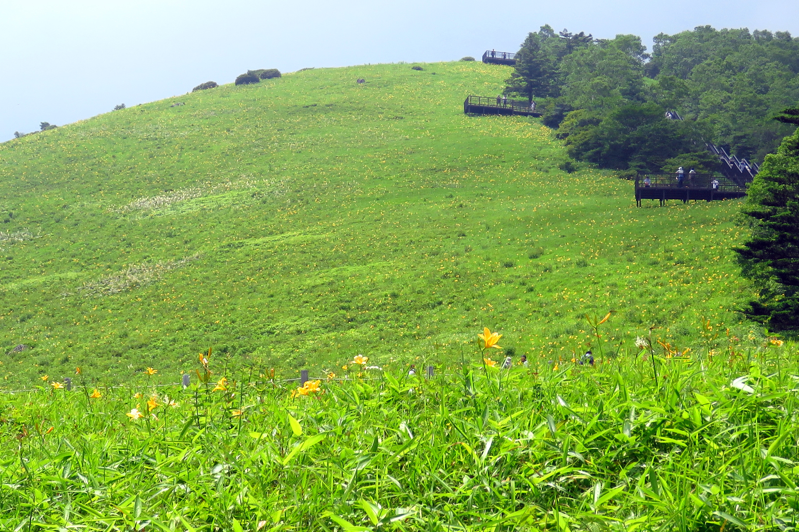 下の方はキスゲをはじめとした花を楽しみながら遊歩道を歩き、少し上からはひたすら階段を登ります。