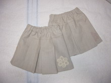 姉妹のプリーツスカートです。 パターン:まいにち着る女の子服 プリーツスカート size100 生 地:プラス・ミラーズ(生地、布) ヒッコリーデニムストレッチ フロッキー加工子供のスカートは何枚か縫っていますが、娘の喜びそうなティアードやフリフリ系が多かったので、プリーツスカートは初めて。作ってみたら、シンプルでスッキリ。履かせてみると、小さな娘達がなんだかお姉さんっぽく見えてすっかり気に入ってしまいました。出来上がりがあまりにシンプルだったので、長女受けが気になり手作り工房 MY mamaさんの【NEW全9色】プチ!プチ!花びらの多い花モチーフのプチバテンレースを色違いで付けてみました。 手作り工房 MY mamaさんのバテンレースは、お手頃価格なのですが1枚1枚綺麗にプレスされた状態で届くので気持ち良い&付けやすい!ソーイングを始め、とりあえず色々買いまくってた(?)時、ここと他店さんと同じようなレースを買いましたが、こちらのお店のレースの方が断然きれいでした。その後バテンレースはあまり使わないのですが(汗)、今回久々に手持ちのものを使って「あ、可愛いかも」と思い、新たに買うなら手作り工房 MY mamaさん!と決めています。右脇のシームポケット袋布は、リネンのお店 LINESEEDさんの54%OFF☆【LECIEN】VINTAGE COLLECTION(Little Heart) これも1年位前に購入した生地ですが、始めは思っていたよりハートが小さく地味な印象で在庫布になりかけましたが、この主張しない感じが逆に使いやすく、バッグやポーチの裏や巾着の口布等ちょこちょこ使って、今回でついに使い切ってしまいました。パッと見で用途も考えずに買ってしまうことが多いのですが、可愛い!っていう生地と使い勝手の良い生地は違うんだなぁって反省しました。子供服・・・うちの場合は小さな娘たち。彼女達の大好きな可愛い色柄&デザインももちろん可愛いのだけれど、あえてシンプルに、シックに・・・って言うのも好きです。小さな女の子って存在自体が甘~いですのもね。でも私が好きなシンプル系は、娘達に言わせると「アジミ(地味)」なんだそう・・・。難しい~。