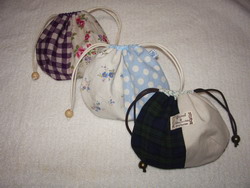 なんだかんだとsnowwingさんモノが続いていますが、昨年ソーイングを始めた私が最初に買った型紙が、snowwingさんのしじみ巾着でした。いろんな方のブログでステキな布あわせで作ってらっしゃいますよね。形がとっても可愛いし、布あわせで色んなイメージに出来るし、なんといっても作るのも簡単なんです。友達や親&姉妹等にあげてしまって残っていないものも沢山ありますがS、M、Lサイズ合わせて15~6個は作っているかなぁ。1番最近、幼稚園のお母さん友達にプレゼントしたのがこの3つ。 奥は手芸ナカムラさんの花柄の綿麻に、紫のチェック。真ん中は、花柄もドットもヨーロッパ服地のひできさんの1枚あたり 105円!YUWA (有輪商店) ハーフリネン 綿麻スラブミニカットクロス【20100316_手芸...。手前は綿麻ブラックウォッチに、綿麻キャンバス。3人それぞれのイメージに合わせて作ったんですが、私的には真ん中が好きでした。あとは、スイーツ柄が可愛いこんなのとか。 ワッフルが気持ちいいこんなのとか。 これらもあげてしまって手元にはナシ。この2つは、リネンのお店 LINESEEDさんの裏表どちらも使える♪♪【メール便送料無料】綿麻リバーシブルチェック×水玉カットクロスセッ...を使いました。このリバーシブル生地、LINESEEDさんで初めて買った生地だったかなぁ。色んなお店で見かけますが、色を絞りきれずこのセットを見て「これだ!」と。使ってみたら同じ色のチェック&ドットのリバーシブルって布合わせに悩まず使いやすかった~。どこのお店でも人気の定番生地なのが頷けます。ブラックは友達に、紫は自分で使っています。 こちらはLサイズ。 持ち手と、サイドにDカンをつけて、ショルダーとして昨年ほぼ毎日使っていました。花柄は上に出てきたヨーロッパ服地のひできさんのYUWAカットクロス。このカットクロス、色々選べて1枚100円!YUWAの生地はとってもステキなんだけどちょっとお高めなので、色々試せて便利です。30×25cm、手にした時は小っちゃい!?って思いますよね。もちろんシンプルに大きめバッグを作る~は無理ですが、こうやって切り替えて組み合わせたりするので、結構使えますよ。タグは響工房さん。こちらはMサイズに持ち手付き。 ちょっと大人な感じのイチゴは手芸ナカムラさんの綿麻タンブラー生地 生成りx赤。口布は、またまた↑ヨーロッパ服地のひできさんののYUWAカットクロス。こげ茶のドットと合わせて、なんとなく「ストロベリーチョコ」っぽいイメージで。自分で使うにはちょっと可愛すぎてしまったので、妹にあげてしまいました。上のLも、こちらも持ち手は生成りテープ(2cm)にソフトチェックバイアス ベージュx生成りを縫い付けて、ちょっとナチュラルな感じに。このバイアステープ、合わせやすく、柔らかいので細・太各色揃えてしまっています。まだまだいっぱい作ったんですが、ほとんど手元にナシ。手順もすっかり覚えて、一番時間がかかるのは布合わせを考える時間かな。しじみ巾着、簡単に作ることが出来て、ちょっとしたプレゼントにちょうど良いんですよね。型紙はボロボロになってしまっていますが、これからも沢山作ると思います。 コレはチェックが細かいそうです ラミネートも挑戦したいなぁ