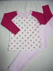 夏休み中は、朝から晩まで元気な姉妹の相手に疲れ、2学期が始まってからも幼稚園の行事だのシルバーウィークだので疲れ・・・ソーイングはちょこちょこしていたものの、とてもブログまでは手が回りませんでした。これから、夏以降に作ったものを記録していきたいと思っています。9月の半ば頃、朝晩急に涼しくなり、慌てて子供達の長袖パジャマを出しましたが、春まで長女が着ていた95サイズは次女行きだなぁ・・・。となると・・・あれ?長女のパジャマが無いよー!?「双子ちゃんですか~?」としょっちゅう聞かれるうちの姉妹。小さめお姉ちゃん、3歳10ヶ月、95cm、12.5kg。そして大きめ妹ちゃん、2歳3ヶ月、90cm、11.5kg。1年7ヶ月差なのに、大きさがあんまり変わらない。長女なりには大きくなってきているんだけど、それを上回る勢いの次女の成長っぷり。パジャマを取られた可哀想なお姉ちゃんに新しいパジャマを!!もちろん在庫豊富な?布山の出番。第1号はこちら。ピンクバージョン。 パターン 上:milimiliさん、女の子ラグランTシャツ サイズ100(パジャマ用にゆったりさせようと身幅を前後で2cmプラス) 下: より パジャマのズボン サイズ100さすがは「大きめ・太目」と言われるLalala3、ズボンが異様に大きかった~。股上はお腹すっぽりどころか胸の上まで。お腹&お尻周りはダブダブ。股下も長~い。2、3回折ってちょうど良い感じ。以前作ったキャミが大きかったんだから気づけばよかったのになぁ、ダメだなぁ。でもパジャマだから、ちょっと?大きくても気にしな~い。本人も大好きなピンクに大満足。第2号はこちら。赤バージョン。 パターンはピンクバージョンと同じ。少々反省を踏まえて、下の股上4cmカット&股下5cmカット。前回の失敗を改める私、エラい。・・・が、手馴れたパターンで油断し、襟付け失敗!!表裏逆に縫いつけ&ジグザグまでかけてしまったので、解くのは最初から諦め、そのまま余分な縫い代カット→さらにジグザグで縫い付けてしまいました。パジャマだから気にしな~い。本人わかってないし。身頃や袖、襟、ズボン等同系色であれこれ切替ているのは、単純に生地が足りなかったから。身頃に使用したLe sucreさんのプリントスムース、Tシャツ用だったんだけど、可愛かった!柄違い、色違いで欲しいなぁ。ピンクの袖も、布の店ブーケさんでTシャツ用に買っていたとても鮮やかなローズピンクで、難はいったいどこ?って位綺麗な状態でした。詳細にあるとおり、天竺なので多少クルクルしたものの扱いやすかったですよ。ブーケさんの詳細は詳しくて、ソーイングビギナーの私にとってとても頼りになります。質問や相談の返事も早いし親切だし、ブーケさん、大好き~!Tシャツ1枚作るにはちょっと足りなくなってしまったのでまた欲しいなぁ。でも、相変わらず購入ペースが消費ペースを上回っていて、布山は更に成長中。と言うことでちょっと反省して、今月は超個人的に「消費強化運動実施中」なんだよなぁ。・・・でも、またブーケさんで違うモノ買っちゃって昨日届いたんですけど。だって、娘達&自分の秋冬物作らなくちゃね!!妹の誕生日プレゼントも作らなきゃね! ・・・明日からまたせっせとハンクラしよう・・・。