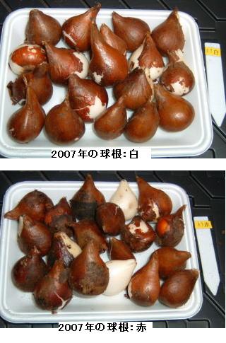 今年も球根の掘り起こしは8月になってからにしました。たまたま、昨年は手が回らず8月に掘り起こしましたが、6月に掘り起こしていたときにはなかった大きな球根が土の中から出てきてびっくり。それらをまた鉢植えにしたら立派に咲いてくれました。今年も期待して8月に掘り起こし。今年も球根が成長してくれました。特に大きかったのはホワイトとレッド。そして更にびっくりしたのは2005年秋に購入した球根たち、今春は2度目の鉢植えできれいに咲いてくれた花たちが結構、立派な球根に生長してくれました。ホームセンターで売っている普通サイズの球根とあまり変わらない程の大きさです。また、秋になったら鉢植えにしようと思います。立派に咲くことが出来たら、鉢植え3年連続開花です。鉢植えの球根は1年限りが定説のようですが、北国だから翌年も使用できる球根が出来るのかもしれません。掘り起こした球根はベンレート液で洗浄し、表面の水分が乾いた状態を確かめ、ネットに入れて日陰干しします。我が家ではたまねぎの入っている袋に入れて車庫に吊るしておきます。鉢植えにしない球根たちは、街路樹の下にたっぷり植え込む予定です。小さいけれど、それなりに可愛い花を一杯咲かせてくれます。
