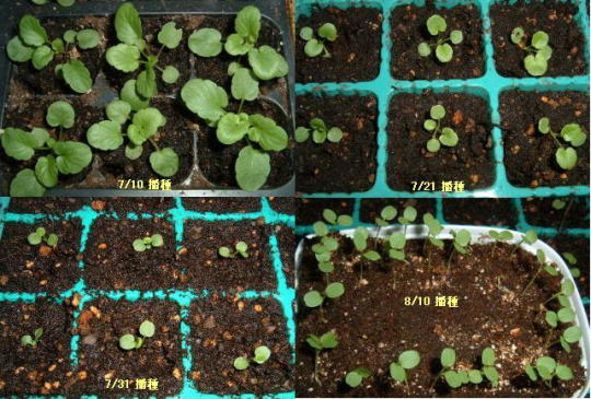 フルーナ ラベンダーピンク(7月10日種まき)F1ライトローズウィズブロッジ(7月21日種まき)ホビットクリームイエローリップ(7月31日種まき)ペニー ホワイトジャンプアップ(8月10日種まき)長雨や連日の暑さでかなり疲れ気味です。特に7月20日、31日の種まきはその後の天候に苦労しました。双葉がすっかり徒長してしまい根の成長がよくありませんでしたがとりあえず移植。今年は歩留まりが低いと予想されます。