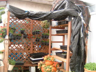 南側の裏庭の一角にラティスをL字型に配置し、日陰を作ってあります。ここに夏越しのビオラやプリムラを置いています。遮光対策はこれで結構うまくいっていたのですが真夏の暑さはビオラの苗つくりにはちょっと大変です。そこで寒冷紗をアーチのてっぺんや周りを囲み、コーナーの天井にも張り陽射しをカットして温度を下げます。かなり暑くなったら更に遮光シートをたらします。これはあまり美的ではありません。寒冷紗が不足なのでとりあえず間に合わせです。ビオラの種まき、苗つくりは温度管理が一番難しいです。これからがビオラ育苗の正念場です。