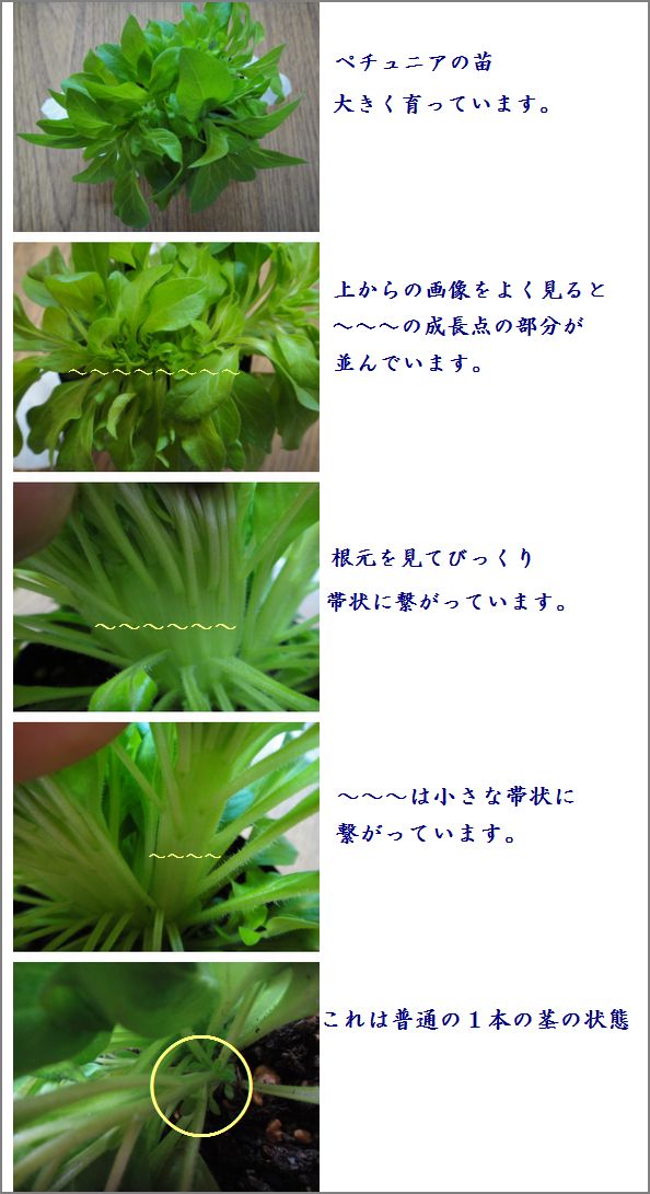 この苗は昨年の夏に種まきしたペチュニアです。ポットの大きさは3号ポット、1月17日、わい化剤のビーナインを散布しました。↓こちらは全体的にまとまって伸びが抑えられコンパクトに仕上がっています。わい化剤が効いた感じです。↓こちらの株はビーナインの散布がまずくて平均に行き渡らなかったようです。部分的に伸びてしまったところがあります。小さな段階でビーナインを使用しました。まだ2号ポットの苗です。全体に散布できたことと、ビーナイン使用時期がこの段階の方が効果があるということでしょうか。表面に見える葉の陰にたくさんの小さな脇芽がびっしり出てきています。ビーナインの散布がまずいためにあちこち不揃いに伸びていた部分の成長点をピンチしました。株同士を離して全体に光が当たるようにしながら徒長を防ぎます。このように株と株の間隔を空け(スペーシング)なければ株が近づきすぎてしまうと隣の株より少しでも光を浴びようと茎だけがひょろひょろと伸びてしまい徒長することになるのでスペーシングがとても大切です。そのような点からも我が家の冬期間の育苗は大きくなりすぎてしまっては場所の確保に困るので、わい化剤を上手に使ってコンパクトに育てられれば助かるのですがその使い方がイマイチ未熟です。ペチュニアの成育実験をしています。たった一株だけなのであまりよいデーターが得られるとは思っていませんが「ちょっとお試し」の感じでいつものお遊び。この苗は一番上にあるAの仲間で8月種まきグループの一株、現在のポットの大きさは2号ポットのまま。Aに比べてこの株だけは日当たりの悪い場所室温も低い場所そのために乾燥がよくないので水やりの回数はかなり少なめ意識的に肥料はやらず、活性液(HB101)を散布、灌水する程度ところが元気に育っているのです。最近は葉色もよくなってきましたし、小さいですがたくさんの脇芽が出ています。徒長はしていません。Aのペチュニアは窓際、室温は終日15℃の設定している場所、そのために乾燥も激しく水やりも多い。等々恵まれた場所ですがかえって過保護でない方ががっちした株に育つのではないかと思っているのです。「奇形ペチュニアのその後」のその後です。何本かの茎が帯状になったまま、ますます大きくなりました。わい化剤について矮化剤は植物をコンパクトに育てるために使用される薬剤です。成長を抑制させる効果があるので、茎と茎の間が狭くなり引き締まって育ちます。主な使用目的は、鉢植えの観葉植物、花木の成長が著しく、すぐに大きくにってしまうのを抑制しコンパクトに育てる目的や、矮性の草花などに散布すると、花がコンパクトにまとまって咲き、引き締まってよく見えるので使用されています。販売されている花木、観葉植物、草花にも矮化剤が散布され売られている事がよくあり、代表的なものはハイビスカス、ポインセチア、菊、ハボタンによく使用されています。矮化剤の種類は葉に霧吹きで散布するビーナイン、もっと効果の強い根から吸収させるスミセブンなどがあります。一般によく売られているのは葉に散布するタイプのビーナインがよく使用され、ダインなどの展着剤と混ぜて霧吹きで新芽に吹きかけるとよい効果があります。矮化剤は成長をコントロールする薬剤なので、乱用などすると悪影響を及ぼすことがあり、他の植物にかからないよう気を配ることも大切です。いつもご訪問いただきありがとうございます。日本ブログ村ランキング参加中です。 よろしかったらクリック↑して応援してね!