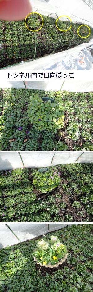 今朝の最低気温は-7.8℃(06:57)、日の出時刻は07:04(昨日)なので日の出前後が一番気温が下がっているのですね。日中の最高気温も-4.1℃(10:28)、この後はますます下がってしまいました。お日様が照っているのですが風が強くて寒いです。でもウオールバスケットや寄せ植えなどは玄関に置いておくよりはこのお日様に少しでも当ててあげたいので戸外に出し、直接、風に当てては寒すぎるのでトンネルの中に入れました。ここは玄関にいるよりは明るいし、暖かなはずです。トンネル内のビオラやパンジーは今朝の低温ではたぶん凍ったのだと思いますがお日様に温められてすっかり元気を取り戻していました。真冬日が何日も続いても、少しでも日照時間が確保されればトンネル内は気温が上昇し、花達はホッと一息、夜間の寒さに耐えられるエネルギーをお日様から吸収できます。明日以降5日間は真冬日の週間予報になっていますが気温は平年値(最低-6.4 ℃ 最高0.6 ℃ )よりもかなり下回っています。明日の最低気温予報は氷点下12℃、これではちょっと可哀相、今季初めての最低低温夜はやはり玄関に連れ帰ることにしましょう。いつもご訪問いただきありがとうございます。日本ブログ村ランキング参加中です。 よろしかったらクリック↑して応援してね!