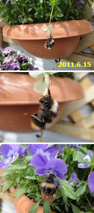 毛むくじゃらで背中が白いハチ、オオマルハナバチでしょうか。交配のお手伝いをしてくれるのでハチさんは大歓迎ジャンプ大失敗のハチさん、間一髪でビオラの花につかまりました。再ジャンプしてブルーのビオラで朝ごはんです。朝一番に美しい羽根を広げて飛び回る「カラスアゲハ」あまり見られなくなった蝶です。見た瞬間、後ずさりしてしまいました。私の記憶では初めてのご対面、そしてあまりにも巨大なカマキリ10cm以上はありました。ご近所の幼稚園に通う3歳の坊やにプレゼント、大喜びでした。幼稚園から帰るとお母さんと近くの原っぱでカマキリの食事の虫取りが日課になりました。ハムなどをやっても動くものでなければ興味を示さないのだそうです。お母さんはネットでカマキリの飼い方を調べて坊やに手ほどき。「蝶々ばかりが続くと食べない」「コオロギがお気に入り」等々、食事の準備も一苦労の様子でした。「だんだんお腹が膨らんできたの」、我が家の前から幼稚園のバスに乗るまでの時間、カマキリの様子をご報告してくれました。とうとう卵を生みつけたとのこと、そのころには原っぱにも虫がいなくなり、「赤ちゃんが生まれたら譲って」と約束していた知り合いの小学生のお兄ちゃんに貰らわれて行きましたとさ。「虫が捕れなくなっているのにご飯はどうしているの?」ペット屋さんに虫が売られているのだそうですね。その後どうなっているのかな~~。裏庭にいつもひらひら飛んでいるモンシロチョウ、葉ボタンの栽培の頃には追っても追っても集まります。蝶の姿は可愛いけれど、置き土産をたっぷり残していきます。1昨年は孵化してしまい、大量のアオムシに葉ボタンを食べらてしまったのでその対策をと考え、昨年は葉ボタンに寒冷紗をかけたのが災いしたようです。さっぱり発色しませんでした。卵をたくさん潰したのでモンシロチョウの恨みかな・・・・。いつもご訪問いただきありがとうございます。日本ブログ村ランキング参加中です。 よろしかったらクリック↑して応援してね!