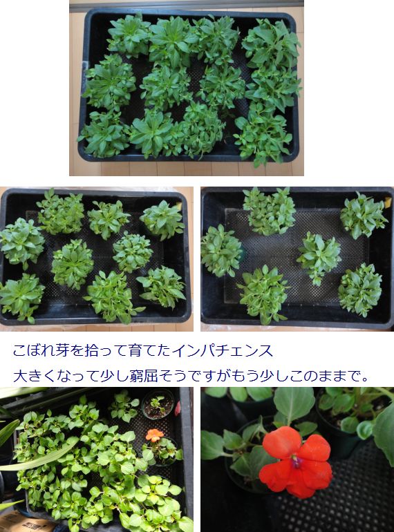 楽しみに待っていたインパチェンスが咲いてくれました。一株で大きく育つ「エキゾチックインパチェンスパッチワーク」と名付けられたお花です。採種出来なかったので翌年のお花は諦めていたのですが鉢から芽を出してくれたのを拾って育てました。咲いてくれるのはいつもマイガーデン定番の「エクストリームディープサーモン」朱赤のインパチェンスばかりで少しがっかりでした。でも今度は違ってました。ディープサーモンは葉の裏側に赤い斑点がありますがそれ以外はパッチワークの可能性が大です。一緒に拾った他のこぼれ種の仲間↓が咲いてくれかもしれないと期待をしています。