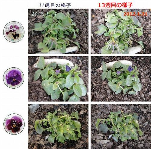 2011年は私の花育ての中で一番辛い年でした。ペチュニア類(ナス科)のお花がウイルス病になったのです。なぜ、マイガーデンにウイルスが蔓延してしまったのか最初は判りませんでした。ところが1昨年の画像をよく調べてみましたら、ウイルス病の症状をしたペチュニアを発見しました。たぶんそれが発症元と思われます。ウイルス病についての知見は全くなかったので、鋏を使いまわし、多くの挿し芽株つくり等々たくさん苗を準備して春を迎えました。さらに春一番で購入したペチュニアも感染した鋏を使ってピンチする等あちこちにウイルス病を広げる結果となりました。もっと、いけなかったのは、それらしいと思いつつも全てを廃棄できなかったことも感染を広げました。そのような訳で2011年のペチュニア類は散々でした。ペチュニアのウイルス病の症状を我が家の例で紹介いたします。 A:葉が針状になったり B:葉の先端部分のみ細くなったりします。 C:葉の表面が凸凹になったり D:まだら模様になります。 E:葉の色もグリーンから黄緑色に変わり、F:お花も変形して綺麗には咲きません。これらの症状は最初からあるわけでないのです。上記のような症状はかなり悪化した状態です。毎日の点検が重要ですが、私の場合にも早く気がついていれば・・・と悔やまれます。しかし、おかしいと思っていても殺菌剤で治るだろう程度の認識しかなかったのです。ウイルス病の名前は聞いたことがあっても、まったく無知でした。少しの異変をも見逃さないように健康で正常な状態の植物の特徴をよく理解しておくことが大切です。下の画像はウイルス病特有の症状が見られます。私がウイルス病発症の元となったと思っている前年(2010年)のペチュニアです。初期の段階では見逃してしまいそうですが、下段の状態になるとかなり異常であることが判ります。しかしこの段階でもまったく気にとめませんでしたので、これが翌年までウイルスを引きずったのだと思います。地元で苗を購入する場合にはよく見て確かめることが大切ですが私のようにネットショップで購入した苗にそれらしい症状を見つけたら直ちに販売元に連絡することが自分や販売店にとってもさらに多くのネット利用者にとっても被害拡大を少しでも食い止めることになると思います。ウイルス病に対して全く無防備でお花達に接してきた私は大きなショックを受けましたがまた多くを学んだ出来事でもありました。決して鋏を使いまわししないこと、よく消毒すること、よくお花を観察して異変に敏感になること。昨年の秋には古い土は全て廃棄し、今年使用する鋏も新しく購入しました。ウイルス消毒液も使おうと思います。今季一番の冷え込みでした。-14.3℃(02:46)氷点下14℃以下まで下がったのは12年ぶりなのだそうです。この程度の寒さは北海道の中ではまだまだ暖かな方だと思います。日中の最高気温も-3.3℃(12:27)、時折ぱ~っと陽が射してくれますが、雪が降り続いています。一瞬の陽ざしに元気になっていてほしいと願ってトンネル内にカメラを入れてみました。寒そうな顔してますがポットの凍み上がりもなく、なんとか元気そうで ホッとしました。いつもご訪問いただきありがとうございます。日本ブログ村ランキング参加中です。 よろしかったらクリック↑して応援してね!