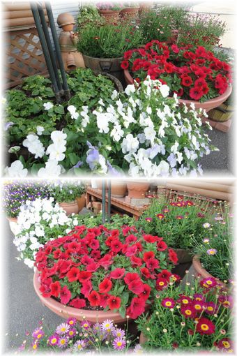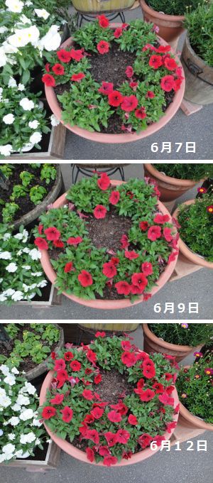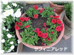 サフィニアをメインガーデンに並べました。この赤いサフィニアは大きな鉢が空くのを待っているうちに咲きだしてしまいました。まだデビューにはちょっと株の仕上がりが良くないのですが裏庭に持っていっても場所がないのでここにそのまま置くことにしました。しばらくしたら表土が隠れるくらいになると思います。ビオラのウオールバスケットがだらしなくなったのでそれと交替したサフィニアです。まだちょっとデビューには早いのですが、疲れたビオラとチェンジしました。我が家定番のサフィニアです。極小輪のペチュニア~商品説明】花みどりマーケットの親会社が育種した、世界最小のかわいい花のペチュニア「ミニチュニア」です。花も葉も小ちゃいですが、生育は旺盛でとても早く、見る見る大きく育ちます。花は絶え間なく咲き続けながら生育するので、秋遅くまで楽しめますよ!ペチュニアは花も葉もベタつき、花がらを取るときに嫌がられます。ミニチュニアは殆どベタつかず、花がら自体もそんなに気になりません。(花みどりHPから引用)商品説明のように見る見る大きくなります。鉢の縁まで広がったらお花を咲かせます。今は出来るだけお花を摘んでいます。今日は実生のインパチェンスの植え込みをしました。ホワイトは65cmのプランターに、後はウオールバスケットも制作苗の状態は小さいのですが植え込んでしまいました。いつもたくさん植え込んで失敗するので今回は5株をゆったりと。ミルフルの満開の様子、素晴らしい花つきです。いつもご訪問いただきありがとうございます。日本ブログ村ランキング参加中です。 よろしかったらクリック↑して応援してね!
