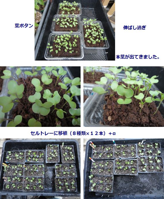 5月21日に蒔いた葉ボタンはすぐ大きくなってしまいました。虫害が怖いのでしばらく風除室に入れて置きましたらすっかり徒長してしまいました。本日ようやくセルトレーに引っ越し、昼夜ともに戸外管理になります。今年の虫害対策はばっちりの予定ですが・・・葉ボタンを育てる悩みは虫に食べられること、蝶が卵をうみつけアオムシに成長してからはガバガバと食べられてしまいます。幼苗の時にも油断すると小さなアオムシの赤ちゃんに食べられます。今年はその対策に殺虫剤を使います。「プレバソン フロアブル5」他にも実生の苗が育っています。発芽から定植まで手間がかかります。既に私の手を離れて自分の居場所を得て伸び伸びと育っている苗もありますがこの子たち↓はまだ少し手をかけてやらなければなりません。ペチュニアはウオールバスケットや鉢植えがこれからの作業です。サルビアは後は定植、長いプランターの準備です。プリムラポリアンサはまだまだ手がかかります。10月頃に苗床に埋め込むまでお世話が続きます。インパチェンスは2回目の種まき、ウオールバスケット、鉢植えにする予定、移植が後2回あります。(移植の回数を減らして直接3号ポットに移植してみようかな)ヘブンリーブルーの発芽が始まりました。このほか、ミニひまわりのタネも動き出しました。(画像なし)ケイトウスマートルックは綺麗な赤です。秋の日に映えるようにもっと大きくしたいと思いますが初めてのお花なのでどのようにしたらいいのか判りません。いろいろ工夫してみようと思います。カスミソウは5月23日にピンチしましたがその後よく育ちました。後はお花が咲いてくれたら嬉しいですが、それはいつごろでしょうか、これも初めてのお花です。アズーロコンパクトの花芽が一杯です。満開が楽しみです。いつもご訪問いただきありがとうございます。日本ブログ村ランキング参加中です。 よろしかったらクリック↑して応援してね!