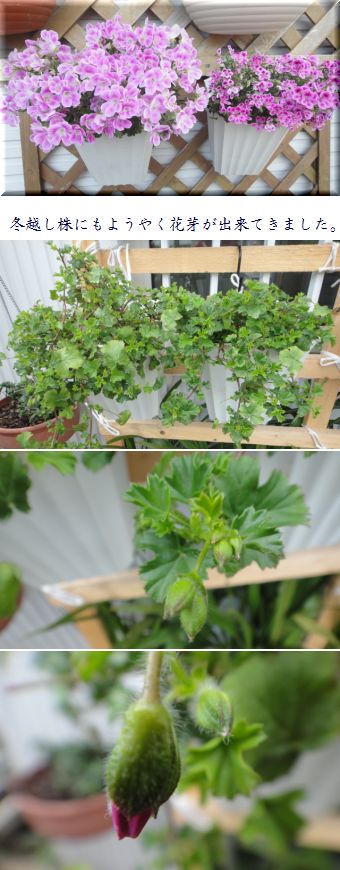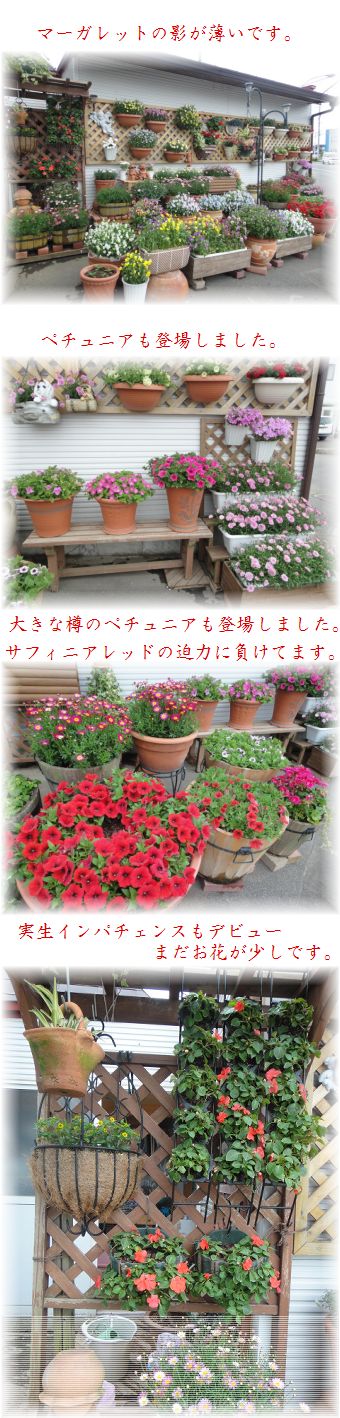 毎日低温が続いています。今日の最高気温は12.8℃、最低は辛うじて二桁をキープして10.5℃でした。今週一杯でマーガレットガーデンにチェンジと思っていたのですが気温が20℃に満たないのでマーガレットの開花は蕾のままお預け、元気なのはパンジーとビオラたちです。この様子ではメインガーデンの主役交代は少し遅れそうです。実生のペチュニアの紅白のソナタとデュオレッドです。咲くのを待っていたのですがウオールバスケットに植え込みました。レッドはもう少しで開花です。八重咲きのペチュニアです。昨年のどなたかのブログで綺麗に咲いていたので私も挑戦、小さな株をさらに株分けしてようやくこれだけ増えたのですけれどでもちょっとカタログの写真と違うのです。「丈の高い鉢からふわりと垂れ下がって溢れ咲く(サカタのタネ)」ほんとにそうなるのかな。「メカルドニア イエロークロサイト」です。1昨日購入したガーデンマムを植え替えました。毎日低温と日照不足が続いているので最初から大きな容器では心配なのでまずは8号のスリットポットからスタートします。一株多いのは昨年のピンクの挿し芽株(一番大きな株)です。いつもご訪問いただきありがとうございます。日本ブログ村ランキング参加中です。 よろしかったらクリック↑して応援してね!