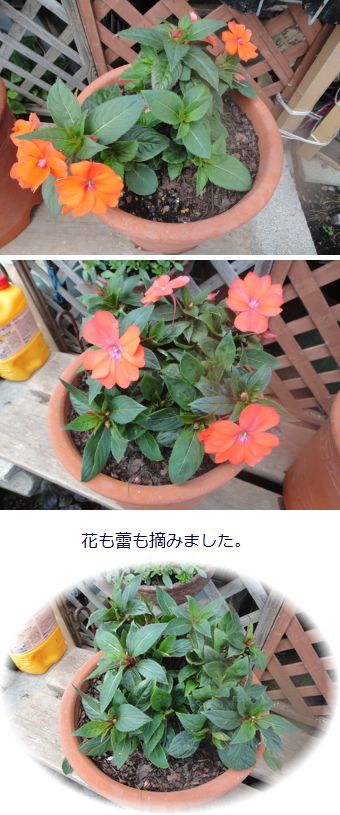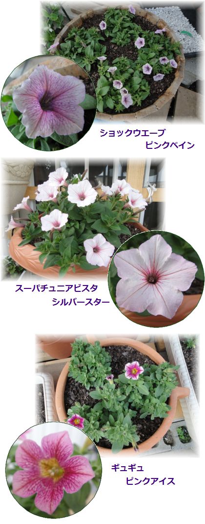 かなり伸び伸びのビオラガーデンですが再デビューの花達がまだ頑張っています。最初からロングランでステージを盛り上げてくれているお花もあってその花達はだいぶ疲れてきました。今年は用土に殺虫剤を混ぜ込みほぼ100%アブラムシの害を防ぐことが出来ましたがうどんこ病が次第に多くなってきました。うどんこ病は比較的高温で湿度が低いと繁殖しやすくなるので、晩春から秋にかけて発生しやすく、特に風通しの悪いところなどでは多発します。逆に雨が続くようなときには発生が少なくなります。うどんこ病は葉の表面で繁殖するので発生初期ならサプロール乳剤、カリグリーンなどの散布も有効です。ただし、葉の養分が吸収されるので、病気が進行している場合は表面の胞子を退治してもその部分は灰色っぽく色が抜けたようになります。また、チッ素過多により植物体が軟弱化している場合なども発生しやすくなるので肥培管理を適切にしてバランスの良い肥料やりを心がけます。(住友化学サイトから)肥料大好きなビオラやパンジーですが肥料のやり方や種類の選び方が肝心なようです。この通り。 窒素全量の内訳は、 アンモニア性窒素と硝酸性窒素で構成されています。 植物の種類によって好みの窒素の種類が違ってきたりします。 例えば、、、 イネはアンモニア態窒素が好きだったり、 野菜は硝酸態が好きだったりします。 花では、、、 硝酸態好きは、アサガオ、コスモス、コリウス、ゼラニウム、ポインセチアなどなど、、、 アンモニア態がちょっとだけ(2割くらい)欲しい植物は、カーネーションやガーベラ、キク、シクラメン、バラ、パンジー,ストックなどなど、、、 アンモニア態大好きな植物は、、、サツキなどがあります。 窒素肥料は、基本的に微生物の作用で、 アンモニア態から硝酸態に変化してから吸収されるようになります。 なので、、、 微生物の少ない用土では、、、(例えば、消毒された土など、、、) アンモニア態から硝酸態への変化が起こりにくいので、 施肥の分量を間違えると、 生育が悪くなったり、生理障害が出てきたりすることもあります。 千葉大学花卉・苗生産ブログ 2010/02/06(土)今年も大好きなバラ咲きダブルインパチェンス「カリフォルニアローズ フィエスタ」を育てます。毎年、スリットバスケットに植え込むのですが、今年は簡単にしました。他にストロベリーポットに「アップルブロッサム」と「ホワイト」を植え込みます。昨年のストロベリーポットに植え込んだアップルブロッサムです。いつもご訪問いただきありがとうございます。日本ブログ村ランキング参加中です。 よろしかったらクリック↑して応援してね!