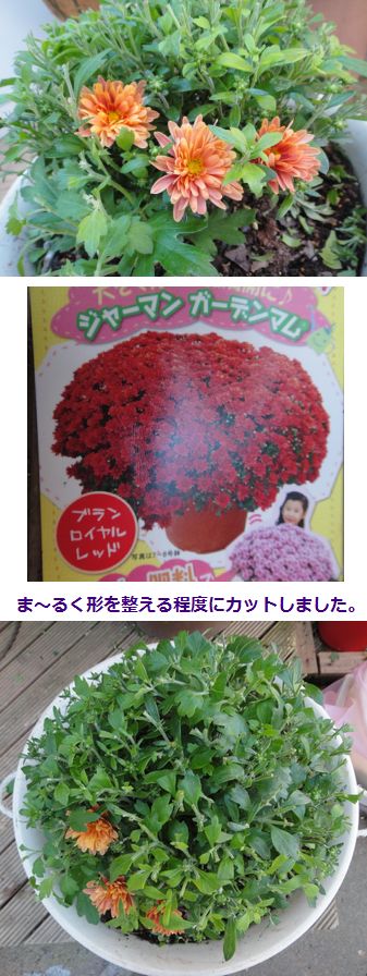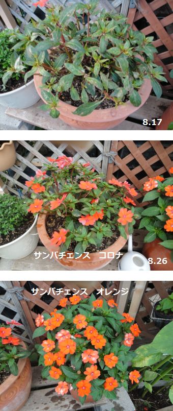 4種類のジャーマンガーデンマムを育てています、ところがお花が咲きだしたらラベルと違っているのでびっくり、秋らしい色なのでこれもいいかな。水涸れした翌日、しな~っとなっていたのですが昨日あたりから葉が「しな~」から「ぱりぱり」に変わってご覧の通りの症状です。しっかり注意してあげなくてはなりません。株が伸びて葉が3号ポットからはみ出しました。スペースを広げてあげたいのですが狭いので葉をカットすることを繰り返しながら育てていきます。窮屈でごめんね。実生のニューギニアインパチェンスですが、暑いのできれいなお花が咲きません。涼しくなったら真っ白なきれいなお花が咲いてくれるでしょうか。ビオラ、パンジーの成長記録です。8月3日にまいたグループです。発芽率は偏りがあって全体的には低いと思います。明日あたりから戸外管理で移して少しずつ風に当てながら本葉が育つのを待ちます。8月11日に蒔いたグループも発芽が始まりました。いつもご訪問いただきありがとうございます。日本ブログ村ランキング参加中です。 よろしかったらクリック↑して応援してね!