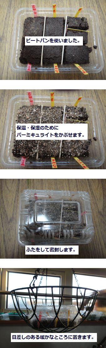 昨夜半からは暴風雨となりました。「風で飛んだりする物がなかったかな~、みんな重しを置いたり片づけたりしたけれど・・・」と、気にかかりました。隣が広い駐車場になっているのでさえぎられるものがないのでまともに吹きあたります。朝、少し風は収まっていました。暴風雨の被害はなかったかな・・と裏庭に行くと・・・。不織布のクリップの留が弱かったところがはずれ、そこから風が入り、吹き上げられてクリップが飛んだのだと思います。クリップの点検がおろそかでした。一つ一つしっかりクリップが止まっているか確かめなければなりませんでした。これからは吹雪になったりするので今日のようなことがあると大変です。10月21日に蒔いたカリブラコアの小さな芽が伸びてきました。一番たくさんの芽が出ている「ラブリカ」を使って育苗培土のテストをしてみることにしました。4種類の用土を試してみます。ピートバンをセルトレーに入れて発芽させました。実験に使う小さな発芽苗は同じではないので比較は難しいですが、今日植え込んだものと比較しながらよりよい育苗培土が見つかればいいと思います。いつもご訪問いただきありがとうございます。日本ブログ村ランキング参加中です。 よろしかったらクリック↑して応援してね!
