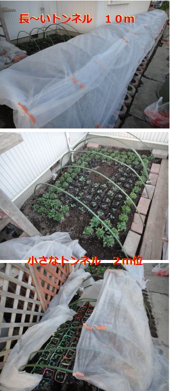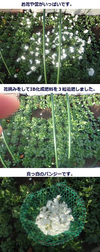 お天気が悪くて作業を中断していた追肥、ホワイトパンジーの追肥をようやく終えました。次回は2,3カ月後にようすを見てから施肥と書かれてあるので、2月頃に様子をチェックします。昨年は当地にとっては珍しく真冬日が続いて大変でした。今年はどうでしょう?吹雪も多かったので不織布2枚重ねではかわいそうなので風避けにビニールを使いました。今年も寒くなってからの作業はつらいので、本日作業を終えました。がっちりとビニールを張ってしまうと風通しが悪くなるので半分だけ張ります。穴も開いているのですが、丈夫な苗に仕上げるためには風通しがとても大切です。昨年からどうしてかな?と思っていたのですが、そのわけがわかりました。「文字がハウスの外側から正しく読めるように張ってください。」と書かれています。これはビニールの表側には、水滴が付きにくくなる加工がされているからです。先に書いたようにビニールが弛んでいたり、裏返しだったりすると水滴がたまってしまい、余計にビニールが弛んだり、重さによってはハウスの骨組みが歪んでしまうこともあるのです(千葉大学環境健康フィールド科学センター花卉・苗生産部ブログ)これでトンネルの最終作業も終了しました。後は花殻を摘んだり、伸びた葉をカットしたり、トンネル全開で日向ぼっこする度にその作業は春まで続きます。日向ぼっこができる日がたくさんあるといいな~。整理することができないわけをお天気のせいにして、ごめんなさい。みすぼらしいままにしていましたがようやくかたずけました。長~い間咲いてくれてありがとう。たくさんの方が注目して声をかけてくれましたよ。来年も育てますよ。いつもご訪問いただきありがとうございます。日本ブログ村ランキング参加中です。よろしかったらクリック↑して応援してね!