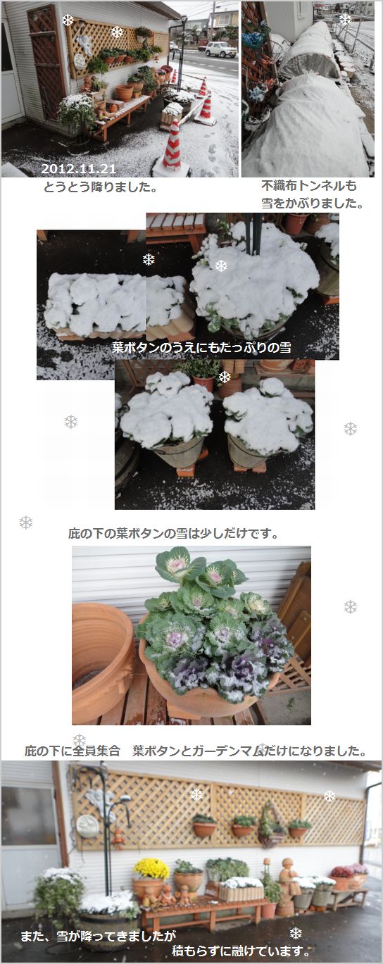 深夜2時ころから台風並みの暴風でした。雨はそれほど激しくなかったのですが風のすごかったこと、とうとう眠れないまま朝を迎えました。朝には風は弱まっていましたが雪を伴って雪景色になりました。日中も雪がちらつき寒かったですが道路はすぐ融けています。しかし、夕方からまた気温が下がってきましたのでアイスバーンになるのでないかと思います。葉ボタンもうっすら雪をかぶってしまいました。特にガーデンマムはすっかり精彩を欠いてしまいました。片づけましょうね。裏庭の不織布トンネルも白くなりました。まだ追肥をしなければならないのが半分残っています。週間予報を見ても暖かな日はなさそうなので、寒くても頑張って終わらせなけれなりません。赤い○で囲んだのはチューリップです。まだ冬越しの定位置には移動していませんが排雪の邪魔にならない場所に積もる前には引っ越します。カタログが届いたのでチラチラと眺めています。今年の種まきで新規購入のものをチェックしてみました。昨年大目に購入したものもあるので今年の購入は多くはありません、プリムラの「ルル チョコエッジ」は春のお花としてはちょっと地味かな? これは考慮の要あり。いつもご訪問いただきありがとうございます。日本ブログ村ランキング参加中です。よろしかったらクリック↑して応援してね!