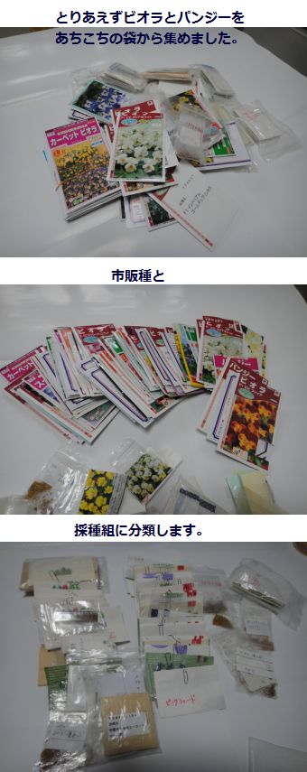 種を保管している袋や缶から取り出して種まきして以来、整理せずにそのままになっていたタネの整理を始めました。たくさんあります。一度に使い切らないので次々に増えていきます。また、蒔いてみたけれど「どうもちょっとイマイチ」と思うのが残っています。このビオラとパンジーのタネは私にとっては宝物。この種のおかげで春先から初夏まで素敵な花たちがマイガーデンを演出してくれるのですから。採種組も毎年増えていきます。今年は採種組もたくさん蒔きました。ブリーダーの方やビオラの生産者の方から頂いた種など、どんどん宝物が増えていきます。市販種はカラー別に分けて整理します。市販種はカタログで新種やシーズンオフになって安くなった種などを購入します。市販種の実物の整理はこの程度で後で冷蔵庫に入れておきます。次のまとめはパソコンです。実物を取り出して在庫を確かめなくともいいようにPCにも整理しておきます。ドキュメントにフォルダを作り、タネの情報を入れておきます。その時にわかりやすいようにカラー別にしています。イエロー系のフォルダを開くとたくさんのタネが載っていますがその中で使用してしまってすでに無くなったもの、次回購入したいもの、自家採種があるもの等々、来年のための情報を整理しなおしておくととても便利です。この次は自家採種のをPCに整理しておく作業があります。できるだけ、自家採種のものを使おうと思います。実は今まではきちんとそろった同じ形、色のお花を一鉢にまたはバスケットに植え込むことにこだわっていました。でもそうでなくともビオラの美しさは十分であると思うようになってきました。むしろそうでないほうがビオラの花たちの多様な美しさがあるのではないかと・・・このことは交配などに関心が向いてきたことも一つの要因かと思いますがビオラとの付き合いも10年になりましたので、私とビオラの第2ステージへの変遷という気がします。後何年ビオラとの付き合いが続くでしょうか。これからは自分で気にいったお花を交配し育て、できれはマイガーデンにしか咲かないビオラがたくさん咲く「ビオラガーデン」を実現できたら短いながらも素敵なガーデニングライフだったと思えるところで終わりたいな~。と思います。いつもご訪問いただきありがとうございます。日本ブログ村ランキング参加中です。よろしかったらクリック↑して応援してね!