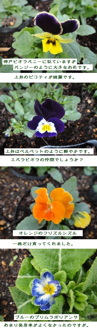 今回の低気圧の影響を受けて大きな被害や停電(まだ復旧せず)などがありました。わが町から 道央自動車道で3時間4分 195.5 kmの距離です。その町に住む多くの方が灯りも暖もない時間を過ごしています。夜間は氷点下になります。あまりにも過酷です。暴風の激しさに眠れない朝を迎えた私には布団のぬくもりがありました。寒さで震えている方々の町に少しでも早く明るさと暖かさが戻ってきてほしいと願います。3日目でトンネルを全開、今回はあれほどの暴風が吹き荒れたのに不織布が飛ばされることもなく、トンネル内のビオラたちも元気でした。今年の春から残したいビオラのいくつかをセルフ交配(同一個体での受粉)しました。でもなかなか難しいです。私の手で交配する前に蜂さんに先を越されたようです。こちらは市販種の「ひぐれももか」、上下のお花の形が違いますね。下段のお花は側弁と下弁が少し変形しています、私はこの形のほうが好き。来年は下段の「ひぐれももか」がいっぱい欲しいな~。どのように交配したらできるかな。今度は蜂さんに先を越されないように・・・。バイオレットとイエローくっきりのビオラは昨年も生まれました。今年はペニーオレンジジャンプアップのグループのところに咲きました。きっとそのあたりがこの子の出生地かな。この子も来年はたくさん欲しい。下段の極小輪のビオラはどこから・・・?ブリーダーさんから頂いた種のグループ以外のところで咲きましたので、種を採って蒔いたら親元が判明できるでしょうか。花弁がちょっと変わったビオラの2番花もやはり変わっていました。これは突然変異? 病気? 処分したほうがいいのかな?いつもご訪問いただきありがとうございます。日本ブログ村ランキング参加中です。よろしかったらクリック↑して応援してね!