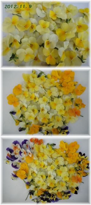 今日もどんよりとした空模様でしたが、最高気温は13.4℃、風がなかったので寒さを感じることはありませんでした。花がら、花、そして蕾も摘み取りました。育苗箱にいっぱいになりました。またすぐ花が咲きだしますが来春までには何度も摘み取って株を充実させます。摘み取ったお花の種類です。このほかにもあるのですが今回は省略、次回に。花摘みしながら変わったビオラを発見しました。6枚花弁があるのですよ。(A)虫の仕業でしょうか?。Bのビオラを見た瞬間、びっくりしました。「なんて几帳面な食べ方をする虫だろう」って。でもこんな食べ方をするなんて考えられませんね。しばし考えました・・・・・、犯人は間違いなく私自身。植え込むときに株をピンチしたのですが、その時に鋏でジョキジョキカットしたのです。その時に蕾もカットされ、その蕾が開花しこのような形になったのだと思います。これなら納得ですね。いつもご訪問いただきありがとうございます。日本ブログ村ランキング参加中です。 よろしかったらクリック↑して応援してね!