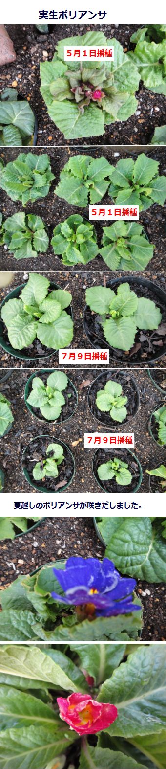 マイガーデンのお花は実生と購入苗、そしてさし芽株。いつ種をまいたらいいだろう、さし芽つくりはいつがいいだろう?と悩みます。ガーデンが賑わう開花期をよく考えて蒔かなくてはなりません。ビオラやパンジー、そしてプリムラ類は暑い時期の発芽、育苗と長い期間の冬越し大きなストレスを乗り越えなくてはならず、大変なことなのだろうな~と、最近、そんなことをよく考えます。夏の暑さ、冬の寒さのストレスを少しでも和らげて育てる方法は??と考えます。暑さにも寒さにも負けないように元気な状態で過ごすためにはその段階でどの程度大きくなっていればいいのだろうか。ポリアンサは例年5月1日に蒔くのです。春までには大きく育って厳しい寒さも乗り越えて春一番にデビューしてくれます。今年は育てたポリアンサの交配を行い、その種をようやく蒔いたのが7月9日、種は完熟させなければならないということなのですっかり遅くなりました。購入種の播種より2カ月も経っていて、発芽したけれど途中でだめになるものもありました。画像はまだ小さいです。冬の間にしっかり大きくなってくれるだろうか、春の開花はいつごろになるだろうか。とちょっと心配です。しかし、遅くなってから交配の種をまいたことでプリムラの種まきの一番いい時期を知るために手がかりが得られそうです。実生のビオラやパンジーの種まきも7月がいいか8月に入ってからがいいか毎年迷います。昨年の暑さを考えて8月からのほうがいいと思ったのですが、今年はかえって8月が真夏日が続き大変でした。9月になってから蒔いたのはまだまだとても小さくて、昨年のように11月から真冬日になったらかわいそうと思ってしまいます。今年インパチェンスで気が付いたことがあります。いつも我が家のインパチェンスは切り戻し後などに葉や花が変形、奇形化するのです。今年はそうした株を別に植え替えて長いこと裏庭で育ててみました。ところがだんだん涼しくなるにつれて正常な株に戻ってきたのです。なぜなのかはわかりません、放っておくほうがいいのではと思ってしまいます。肥料の与え方を工夫することも考えてみようと思います。最低気温2℃の日も軒下で元気でした。インパチェンスは暑さには弱く、寒さにはかなり強いです。私はインパチェンスは夏のお花というイメージで今までず~っと付き合ってきました。インパチェンスが一番生き生きと咲く時期を考えてお世話しようと思います。ガーデンマムの仲間で一番開花が遅れていたピンク、ようやく少しお花が増えました4種類のお花が一度に咲いてくれるのはなかなか難しいです。オリズルランはまだ戸外ですが、一夜にしてだめになることもあるので要注意です。いつもご訪問いただきありがとうございます。日本ブログ村ランキング参加中です。 よろしかったらクリック↑して応援してね!