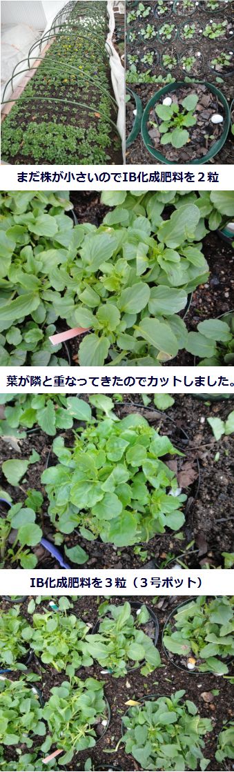 最低気温は0.2℃でしたが今朝、雪がちらちら舞ってました。最高気温は6.3℃、日差しがあったので不織布トンネルを全開。元気なビオラ、パンジーの様子にほっとしました。葉っぱが伸びてきたところは風通しをよくしたり日差しが当たるようにまた散髪してあげましょう。新しい開花のビオラです。クリアイエローやローズピコティは久しぶりです。昨日の肥料の続きです。今までは追肥は手元にある液体肥料や固形肥料を施すだけだったのですがよく肥料の中身に注目しなければならないようです。今まではチッソ:リン酸:カリの数値だけ見ていたのですが、チッソの中身が特に重要。窒素全量の内訳は、アンモニア性窒素と硝酸性窒素で構成されています。植物の種類によって好みの窒素の種類が違うのだそうです。「例えば、、、イネはアンモニア態窒素が好きだったり、野菜は硝酸態が好きだったりします。花では、、、硝酸態好きは、アサガオ、コスモス、コリウス、ゼラニウム、ポインセチアなどなど、、、(マイガーデンの夏の主役のペチュニアは硝酸態好きです。)アンモニア態がちょっとだけ(2割くらい)欲しい植物は、カーネーションやガーベラ、キク、シクラメン、バラ、パンジー,ストックなどなど、、、アンモニア態大好きな植物は、、、サツキなどがあります。窒素肥料は、基本的に微生物の作用で、アンモニア態から硝酸態に変化してから吸収されるようになります。」(千葉大学花卉・苗生産部ブログより引用させていただきました。)また使用法によっても葉面散布と潅水の場合の液肥はそれぞれちがえた方がよいというハイフラワーの農場長さんのアドバイスを頂きました。どのように違えた方がいいのかというと葉面用にはアンモニア性窒素が多く入っているもの、灌水用には硝酸性窒素が多く入っている方がよいそうです。我が家で使っている追肥用の肥料です。追肥(液体肥料)A B-1 B-2 C D Eそのほかによく見るとさまざまな栄養素が入っています。お花も人間と同じで主食のチッソ・リン・カリだけでは健全な成長も維持もできないということですね。今までは同じ種類のものばかり使っていたのですが、商品によってさまざまに違う成分や量がでできています。人間も同じものばかりでなくさまざな食材を組み合わせて食べたほうがいいので肥料も同じものばかりでなくいろいろ使ったほうがいいと思うようになりました。みなさんはいかがですか。追肥(固形肥料)化成肥料 IB態窒素肥料 IB化成 S1号 メーカー名:三菱化学アグリ株式会社 メーカー商品名:IB化成S1号N:P:K:Mg = 10:10:10:1適用:花木・花卉・樹木・果樹・野菜 用途:元肥・寒肥・追肥施肥量 (様子をみながら2~3ヶ月に 1回) 5号鉢の場合:3~ 4粒 10号鉢の場合:7粒 (鉢の号数×70%)~鉢号数 の粒数 窒素内訳はIB態窒素 80%、尿素 20%。IB態とはイソブチルアルデヒドと尿素の反応で作られた合成有機チッソ化合物 イソブチリデン2尿素 の略称。IB態窒素はじわじわとゆっくり効き植物にはアンモニア態窒素として吸収されます。いつもご訪問いただきありがとうございます。日本ブログ村ランキング参加中です。よろしかったらクリック↑して応援してね!