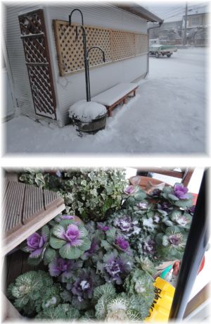 毎日雪が降り、気温もかなり低くなってきました。葉ボタンはすべてを冬越しできないのですがあちこち分散して様子を見ています。玄関風除室に取り込んだ大きな樽植えの葉ボタンは水やりを控えていたので今のところは凍ることもなく何とか形を維持しています。発色は相変わらずよくありませんが、この程度でもきれいなので満足しています。こちらは少し暖かなところでお世話しています。家の中に引っ越ししてからは少しですが色が広がってきました。下葉を少し取り除いてたほうがグリーンとホワイトのコントラストがきれいになると思うのですがそのままにしています。処分した葉ボタンを切り花にしました。最近はちょっと疲れてきたようでだんだん変色してきました。芯の部分がライム色になってきてとてもきれいなのですよ。来年はこのような感じに仕上がるような多粒蒔きに挑戦したいです。いつもご訪問いただきありがとうございます。日本ブログ村ランキング参加中です。よろしかったらクリック↑して応援してね!