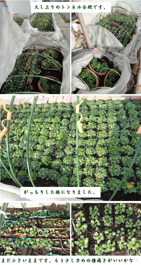 5日ぶりにトンネルをあけました。元気であることは例年の経験から予想はつくのですがそれでも実際にビオラやパンジー、プリムラの顔を見なければ不安です。9時過ぎ頃には不織布の合わせ目が凍りついていて開けることができなかったのですが正午には融けてしっかり全開できました。すでに水やりを控えてから1カ月ほど経ちますが、雨が降ったり、積もった雪が融けたりした水分が苗床を潤してくれています。ちょっと種まきが遅かったかなとおもうビオラたちが心配ですが、今年は早めにビニールで風対策をしましたので頑張ってくれると思います。ちょっと変わったビオラが咲いていました。自家採種のグループから生まれる「ちょっと変わった」お花に興味が出てきました。当地は雪は1週間ほど降りませんので積雪量は0です。道路も家の周りもすっかりきれいになっています。車庫の庇の下に置いているチューリップのコンテナにはしばらく水やりしていませんでしたので、今日は雪捨て場に残っていた雪を運んできて水分補給しました。いつもご訪問いただきありがとうございます。日本ブログ村ランキング参加中です。よろしかったらクリック↑して応援してね!
