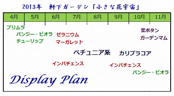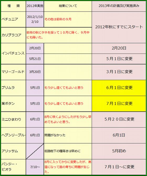 今日は朝から雪かきをしました。濡れ雪だったのでちょっと大変でしたがこれくらいで弱音は吐けません。日中は融けてトンネルの雪もなくなったのですが、またまた夕方から降り出しシバレもきつくなりました。道路はすでにテカテカ光っています。冬の雪かきで体力アップを図り、夏のガーデニングのために体力を蓄えておくことにします。家の中では小さな実生苗がなかなか大きくならずゆっくりゆっくりです。そろそろ種まきの計画を立てようと昨年のブログを見たらなんと昨年の同じ日に種蒔き計画をアップしていました。さっそく、手元の実施記録と比べながら2013年用のマイガーデンの種蒔き計画を作りました。毎年変わってしまいますが、これも気象状況の変化で仕方ありません。当地は真夏日もなく(少なく)真冬日もなく(少なく)過ごしやすい地域だったのですが最近は暑すぎて、寒すぎて、そして昨年は平年の4倍の積雪量で・・・・いろいろ考えて、今年の種蒔き計画を作りました。種蒔き計画だけでなく、今年のガーデニングで心がけることはお花の種類を少なくすること、そして数もできるだけ少なくすることです。「10年はガーデニングをたのしみたい」と始めたのですが、すでに10年が経過し、11年目を迎えます。あまり無理せずこれから先はのんびり楽しみながらお花と付き合いたいと思います。このほかに購入の苗や、さし芽株などがあります。ペチュニア・カリブラコア類は昨年用は前年の9月の内に種まきしたのですが、今年は寒くなってからなので発芽や育苗で苦労が多く、来年は育苗期間が長くなりますがはやり9月中には蒔いたほうがよいように思います。インパチェンスの2回目播種はあまり暑くならないうちに株をしっかりさせたいので少し早目にしようと思います。プリムラ、葉ボタンは今年よりも種蒔きを遅らせてみようと思います。マリーゴールド、アリッサムはマイガーデン用というよりも昨年から始めた隣家の事務所前の街路樹の裾周りに植えるためのお花ですので少し早めます。パンジー、ビオラは今年は例外で6月1日から始めました。その結果問題なく育ちましたので、早く育ててポットを大きくしてみることをやってみようと思います。秋の内にたくさんお花が咲いてくれる楽しみもありますので。いつもご訪問いただきありがとうございます。日本ブログ村ランキング参加中です。よろしかったらクリック↑して応援してね!