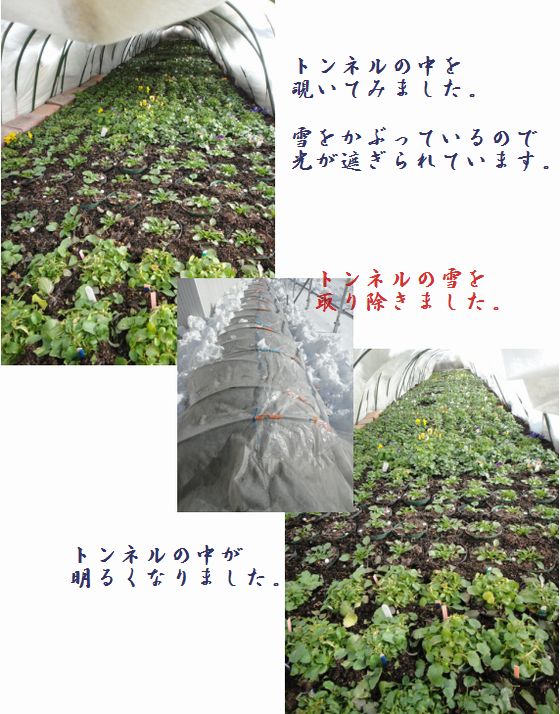 17日以降、ず~っと雪をかぶったままだったので中の様子が分からなくて気になっていたトンネルの中の苗たち、今日は晴れてお日様がポカポカ。それでも氷点下0.3℃、トンネルの入り口から覗いてみたらかなり土が凍み上がっていました。雪を取り除いて日光が入るようにしました。12月に1週間も真冬日が続いたり、最低気温が10℃以下になるのは当地では珍しく今後の異常気象が気になります。今朝の北海道新聞の記事によると当市の水道管の凍結が12月に入ってから240件、過去10年間の12月期の修理要請としては異例の数値、例年は20~25件止まりですから実に10倍です。寒さが厳しくなると水道管の凍結防止には注意を払い、それなりの対策を講じますが、12月中はまだ大丈夫と思うほうが多いのです。それが今年は大丈夫ではなくなっています。寒に入ってからの1月から2月にかけてが一番の厳しい寒さ、その対策に不織布トンネルにさらにビニールをかけるようになったのは昨年からです。今年は12月中からビニールを準備してよかったです。それでもご覧のように苗床が凍み上がっています。やはり真冬日が1週間続き、日光も差さない日ばかりですとしばれが戻ることなくますます凍み上がってしまいます。今日は日差しがあったので午後3時には苗床の凍結がかなり緩みました。明日は最高気温が6℃の予報です。その後の年末年始はまた寒さがぶり返すようですが、苗たちにとっては明日はほっとできる日になる思います。願わくば少しの時間でも日差しがあってほしいと・・・・。所々で花が咲いていますが花も葉も小さく丸まって寒さに耐えているようです。ポットが凍み上がり浮いてしまうまでにはなっていなかったので少し安心しました。ポットが浮いてしまうと根の成長が不十分な小さな苗は水を吸い上げることができなくなってしまいます。さりとて、水をかけるわけにはいきませんのでこのことが一番気になります。いつもご訪問いただきありがとうございます。日本ブログ村ランキング参加中です。よろしかったらクリック↑して応援してね!