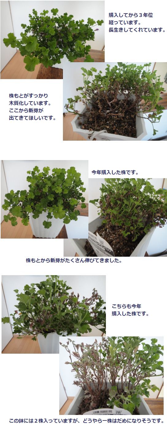 今年マイガーデンを飾ってくれたぺラルゴニウムは4鉢(6株)でしたが現在は3鉢(5株)です。私にとってはなかなか手ごわい、いつまでたっても気心が分からない相手です。最近ようやく新芽が伸びて元気になりました。↓の画像上段は今年購入のHakusanの小輪ペラルゴニウムウランパッソ「バイオレットメロディ」と「ピンクブロッサム」下段は同じHakusanのエンジェルアイズシリーズの「ビオラ」、どちらもよく咲いてくれました。木質化してだんだん株が老化してきたのでピンチした穂先を挿し木にしようと思います。ゼラニウムと同じように切り口を少し乾燥させてから挿してみることにします。時期的には無理だと思いますが・・・。今までゼラニウムのさし芽は成功したことがありません。(絶対成功させたいという思いが強くないので、だめなのですネ)いつもご訪問いただきありがとうございます。日本ブログ村ランキング参加中です。よろしかったらクリック↑して応援してね!
