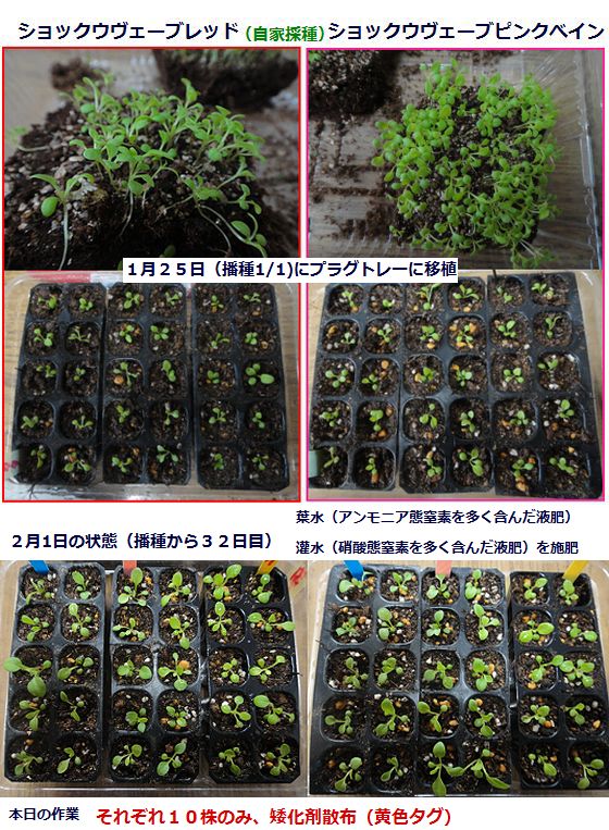 1月1日播種の実生ペチュニアについて成長の様子を記録し、育苗のあり方をまとめようと始めました。1月25日のブログからの続きです。25日にピートバンからプラグトレーに移植後、すべての株がしっかり伸びています。毎朝、活性液または液肥(アンモニア態窒素が多い液肥)の1000倍希釈液を葉水、表土が乾いたら用土の硝酸態窒素の多い肥料(微粉ハイポネックス)500倍+活性液を潅注潅注の量はほんの少しだけ、底穴からあふれるほどはやりません。今日の作業は「矮化剤の散布」です。私が矮化剤を使う大きな理由は1.徒長を抑制する。(冬期間の室内での育苗は通風が悪く、さらに日光不足の影響で徒長しやすい。)2.脇芽の成長を促す。(矮化剤を成長点に散布することによって、脇芽の成長が促されます。ウイルス病体験後は極力、ハサミを使うことを避けているので 矮化剤によって脇芽がよく出ることは私にとってとてもうれしいことです。)千葉大学環境健康フィールド科学センター花卉・苗生産部さんのブログを引用させてただきました。「矮化剤は、草花類や花木類などの茎の伸長を抑制する効果があります。 その他に矮化にともなって茎が太くなったり、節間が詰まったり、 葉の色が濃くなったりして品質を向上させる効果もあります。 植物や矮化剤の種類によっては花芽をつけさせる効果もみられたりします。 矮化剤は、主に細胞の伸長に影響するジベレリンの合成を阻害するものがほとんどです。 でも、、、ジベレリン合成阻害剤ではない矮化剤もあったりします。 これです↓ ビーナインという矮化剤です。 ダミノジッドという成分が含まれていますが、 この成分によって、 植物内のオーキシン合成を抑制して、 さらにエチレンの合成を助長することによって、 植物に矮化効果が現れます。 矮化剤の中では、早くから実用化されたもので、 いろいろな植物に利用されています。 ビーナインは、 根からあまり吸収されない矮化剤なので、 茎葉に散布して使用します。 散布した成分は、植物体内で移行することが少ないので、 ムラが出ないように均一に散布することがポイントになります。 散布してから24時間経てば、雨が降っても成分が落ちたりしません。効果は、だいたい3~4週間前後は持続しますが、 植物の種類やそのときの生育状態や環境などによっても 効果の度合いと持続性が変わります。2011/07/28(木) 06:06:05 千葉大学環境健康フィールド科学センター花卉・苗生産部ブログ」矮化剤の使用に当たっての注意点としては、矮化剤は、これから伸びていく枝や茎に対しては抑制効果があるが、すでに伸びてしまった枝や茎を縮める効果は無いので散布の適期を逃さないことが大切である。矮化剤を使用した後は、植物をしっかり肥培し、がっしりした、良い新芽が育つよう、管理に気を配る。使用後の管理が悪いと、かえって形の悪い、貧弱な株に育ちかねない。矮化剤を散布された植物は、全体的に枝・茎が太くなったり、葉が厚く、色が濃くなったり、という特徴が現れることが多い。ただ、矮化剤の効果は、長くても一年以内に切れてしまうので、そのような特徴は、いずれ消滅する。矮化剤はペチュニアだけでなく、カリブラコアにも使用しています。この場合にもどの成長段階で使用するのが効果的なのかよくわからないままで使用していますので、その時期についてもいろいろ様子を確認しております。1月25日に種を蒔いたペチュニアが発芽しました。まだほんの少しですが。今回は早かったです。昨夜確認できたので6日目で発芽です。ペレット状のタネは前回もあまり良い発芽ではなかったので、この後、どうなるのか心配ですが2月5日ころまでは今の状態を維持しておきます。ピンクのゼラニウムが咲いていました。これは2008年の実生のゼラニウム、4年以上経過しましたが毎年元気に育ってくれています。いつもご訪問いただきありがとうございます。日本ブログ村ランキング参加中です。よろしかったらクリック↑して応援してね!