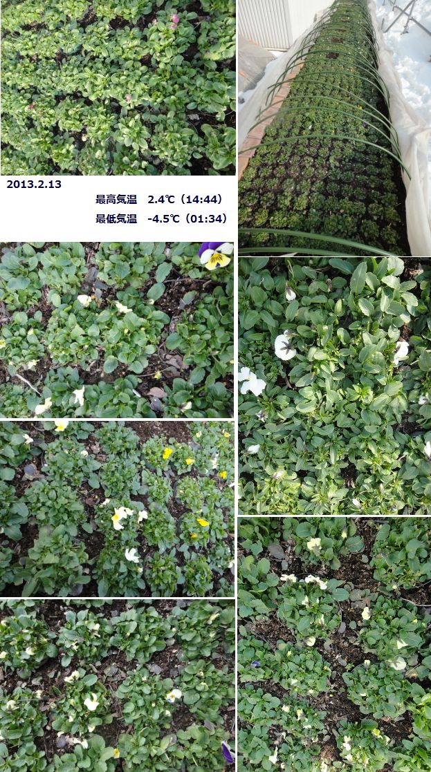今朝はとても冷え込み、6時40分に-10.6℃を記録、日中も-1.4℃、真冬日でしたが日差しがたっぷりあったのでトンネルの中はぽかぽかでした。風が冷たいのでトンネルは開けずに覗くだけにしました。ず~っと気にかかっているビオラがあります。9月になってから遅く蒔いたクリアホワイトです。今年は寒さが厳しいので成長が悪く、苗床に埋め込むときにも心配だったちびっこたちでした。10月30日の埋め込みの画像ではポットの苗が見えないほど小さかったのです。半月経ってようやく少し大きくなっているのが分かります。このような状況だったので今年の厳しい冬はきっとだめになってしまうのではないかと思っていたのですが、先月確かめた時よりもかなり成長していました。これなら大丈夫、後ひと月したら先輩の苗たちに追いつきそうなると思います。ほっとしました。画像手前のビオラ苗の葉も健康色に変化してきました。他の苗たちも元気です。大きなパンジーがひときわ目立っていましたので撮りました。この2種類のパンジーはこれから本来の色が出てきます。モルフェは側弁と下弁がイエローになるととても美しいパンジーになります。ゴールデンプリンセスの赤いブロッヂもとても可愛いくなります。どちらも暖かになると素敵にお化粧して美人になるので楽しみです。いつもご訪問いただきありがとうございます。日本ブログ村ランキング参加中です。よろしかったらクリック↑して応援してね!
