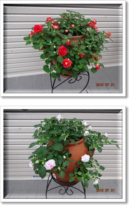 今年のサマーガーデンは赤いお花がいっぱいです。サントリーサフィニア、ショックウェーブ 、インパチェンスグループそれにバーベナ、カリブラコア、ゼラニウム等々、このように赤いお花が集まるのも珍しいことです。なぜレッドが集中したかというと昨年育てたサフィニアレッドに魅せられて今年は苗を昨年より多く購入したこと、昨年のレッドに種がついていたので其れを蒔いたら思いがけず親と同じような立派な苗になったこと、いつもほしいと思いつつ購入できなかったカリフォルニアローズの「サンライズレッド」が購入できたこと。インパチェンスはいつもオレンジのほかにレッドやスカーレットなど赤系をたくさん実生で育てたこと、ショックウェーブのレッドも自家採種を蒔き、綺麗なレッドが生まれ育ったこと、昨年の赤いバーベナの挿し芽株がたくさん育っていること、カリブラコアの真っ赤もあります。いつもご訪問いただきありがとうございます。日本ブログ村ランキング参加中です。よろしかったらクリック↑して応援してね!