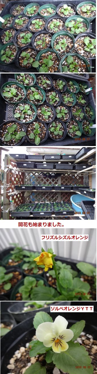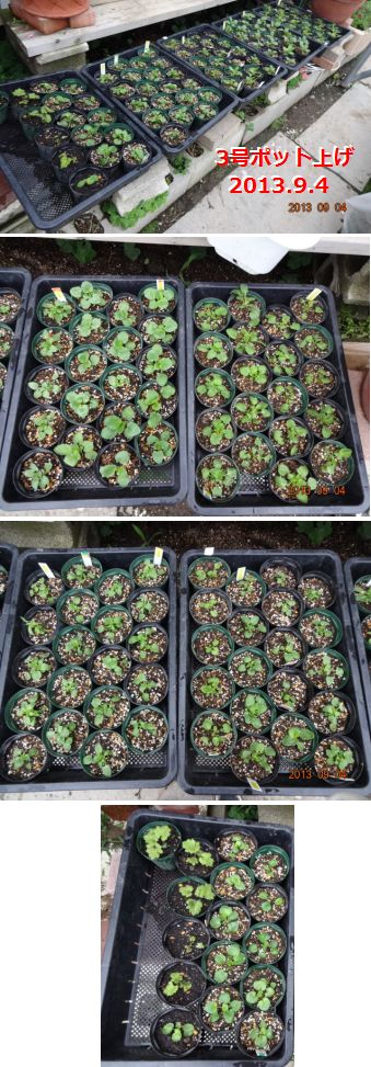 実生ビオラの蕾が大きくなってきて、狭いセルで育てるのも限界かなと・・・・、雨が多いので雨除け場所の確保もしなければならず、いろいろ考えていましたがようやくサイズアップに踏み切りました。今日の移植は7月4日の試験蒔きのグループ。ほとんど落ちこぼれなく育ってくれました。パンジー・ビオラの用土我が家のビオラ・パンジーの用土は10月中旬から3月までの長期間、さらに厳しい寒さでの不織布トンネル使用の育苗を考慮しなければなりません。厳寒期の1月から2月の期間はほとんど水やりをせずに育てます。雪、雨の水分が不織布を通してポットや苗床に浸み込み、その大地に根を伸ばし、水分を吸い上げて生き延びます。ビオラのポットの用土は「パンジー・ビオラの土」(プロトリーフ)を使いました。3年ほど前に立ち枯れ病でほとんど全滅させてしまったのでその翌年から市販の培養土にしました。。この用土は通気性に欠けるようなので今年は2割程度パーライトを混ぜてみました。我が家ではお花の種類によって赤玉土主体のものとピートモス主体のものを分けて使っていますがピートモス主体のものは乾き過ぎると水の浸透性も悪くなるので、冬期間は赤玉土主体がいいのではないかと考えています。肥料について長い育苗期間の元肥については昨年から元肥「ハイコントロール オール10 」N:P:K:カルシウム = 10:10:10:101リットル当たり50g(昨年は30gでした)「全窒素 10%の内、アンモニア性窒素 4.3%・硝酸性窒素 5.7%。特殊樹脂被膜で形成されており各種溶出タイプがあり施用時期、肥効期間などを考慮してもっとも適した日数タイプを選択できます。濃度障害が無く徐々に溶出するため肥効期間が長く安定した効き目を期待できます。」追肥についてはその時期になったらまたメモしておこうと思います。今日のポット上げのビオラは4種類、今年の春の様子です。上から順にオルキブルーシェード(パンジー)ペニーオレンジジャンプアップペニーピーチジャンプアップソルベオレンジYTT雨ばかり続いていることもあってガーデンマムがどんどん伸びています。昨年は10月8日にはメインガーデンデビューでした。いつもご訪問いただきありがとうございます。日本ブログ村ランキング参加中です。よろしかったらクリック↑して応援してね!