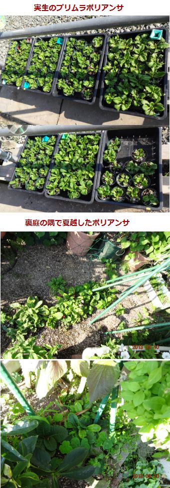 プリムラポリアンサの実生苗はIB肥料を追肥してから長雨に打たれたので肥料が効いたのでしょうか。とても元気に伸びだしました。また葉っぱをカットしてマイガーデン流のスペーシングをしなけれななりません。採種後、庭の隅で夏越したポリアンサの株分けをようやく終えました。根の活着を促そうと腰水作戦です。トマトときゅうりの菜園コーナーを今日でおしまいにしました。片づけた後に即席の棚をつくりビオラの育苗箱を並べました。今までは場所がないので狭い棚に押し込んでいた状態でしたがこれなら水切れの点検もしやすいし、日光、夜露朝露もいっぱい浴びることができます。ビオラの株は順調に育っていると思います。9号ポットに移植してから2週間が経過したので次の作業は追肥(IB化成肥料)です。かなり放りぱなしのムスカリも時期になると葉っぱを出して存在を主張しています。今年はほとんど種ができませんでした。この時期になると「来年も育てよう」とか「来年はやめておこう」などと考えます。今日咲いているお花の中から、来年も育てたいサフィニアの候補です。いつもご訪問いただきありがとうございます。日本ブログ村ランキング参加中です。よろしかったらクリック↑して応援してね!